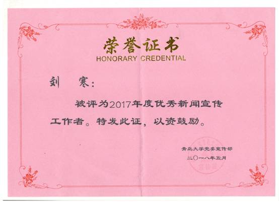 在5月9日上午召开的青岛大学2018年度新闻宣传工作会议上,我院荣获校2017年度新闻宣传工作先进单位,学院网站被评为学校2017年度优秀网站,“青大经院”微信公众号被评为2017年度校内最受欢迎微信公众号,刘寒同志被评为2017年度优秀新闻宣传工作者。