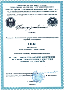 会后,峰会主席高校塔吉克斯坦国立经济大学校长K.A.沙里波夫教授致函经济学院院长刘喜华教授,对开云网页版登录入口给予此次论坛的大力支持致以感谢,希望双方后期继续加强上海合作组织国家间经济学科学术、科研、学生培养等领域合作。并为我方代表团逯进教授发来感谢状,感谢青岛大学代表团在此次圆桌论坛的热情参与。