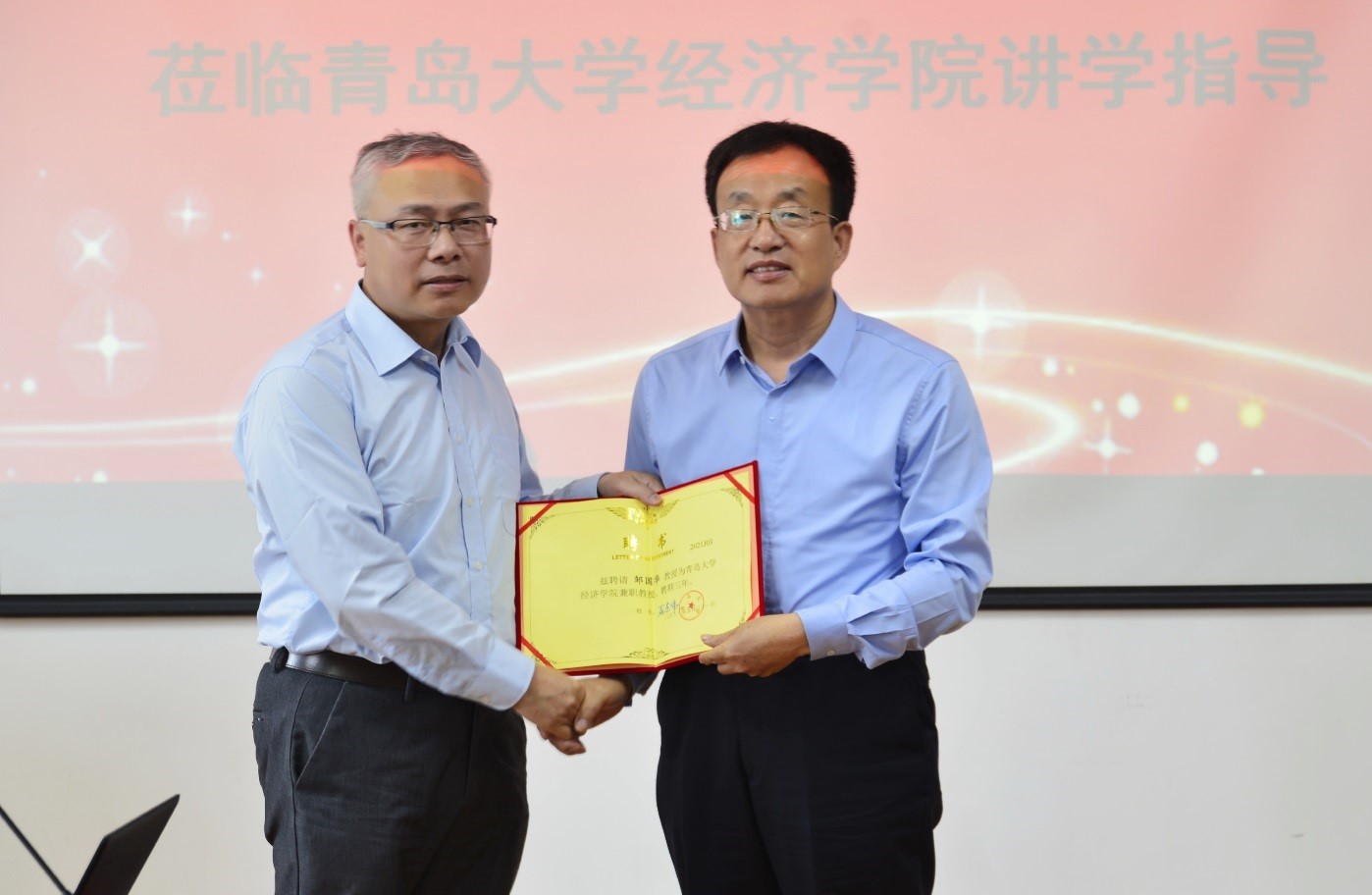 2021年5月31日下午,经济学院在金家岭校区举行了兼职教授聘任仪式,首都师范大学邹国华教授受聘为开云网页版登录入口兼职教授,经济学院刘喜华院长为邹国华教授颁发了聘书。聘任仪式结束后,邹教授做客经济学院“经济学名家讲堂”,为全院师生做了《Model averaging estimation for probability density functions》的精彩学术报告,讲座由陈东景副院长主持。