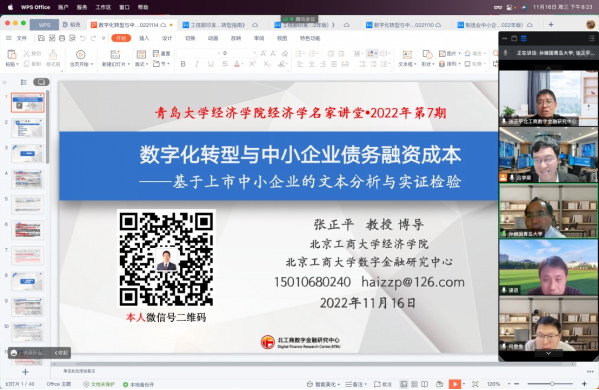 2022年11月16日晚上19:00,北京工商大学经济学院、北京工商大学数字金融研究中心张正平教授受邀线上为全院师生做名为《数字化转型与中小企业债务融资成本:基于上市中小企业的文本分析与实证检验》的学术报告。