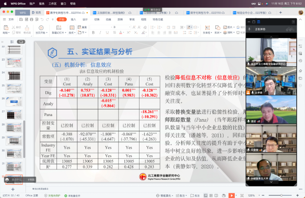 张教授系统性分析了数字化转型对中小企业债务融资成本的影响。张教授的研究发现:数字化转型显著降低了中小企业债务融资成本,经过内生性分析和稳健性检验后仍成立;数字化转型通过缓解信息不对称(信息效应)﹑改善内部管理质量〈管理效应)降低中小企业债务融资成本;相比之下,在重污染行业、非国有产权和高科技属性的中小企业中,数字化转型对其债务融资成本的降低作用更强烈。讲座后,张教授与参加会议的师生就研究选题、因果识别、方法选取等方式进行了积极互动与交流,师生受益匪浅。
