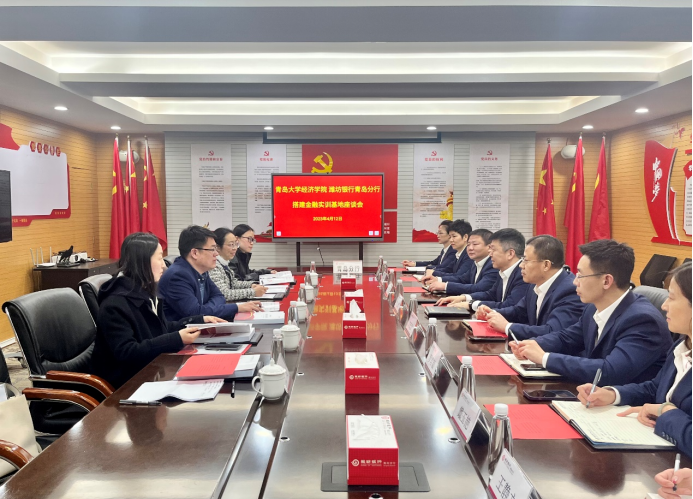 在潍坊银行青岛分行,分行党委书记、行长嵇海涛对张守珩一行表示热烈欢迎,详细介绍了分行与青岛大学前期的合作事项,并希望以学生实习实训项目开展为契机,与经济学院拓展更多合作领域,在党建共建、工会交流、学生文化活动方面寻求更多有意义、有意思的合作共赢点。张守珩感谢潍坊银行对我校毕业生的重视和认可,介绍了经济学院专业设置和毕业生结构,指出双方可在人才培养模式、课程设置、企业岗前培训或深造、科研横向课题等方面多层次、多维度地开展合作。于文洁表示愿与银行一道,开展金融知识宣讲志愿服务活动以及供需对接就业育人合作,在“专业+实践”方面有更深入的互动。
