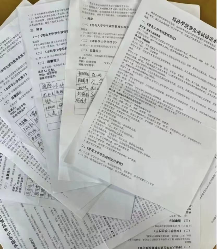为加强经济学院学风建设,强化诚信教育和法律法规、校规校纪教育,增强学生“以诚信守纪为荣,以考试作弊为耻”的观念,2023年6月7日至2023年6月17日,经济学院学工办组织各年级开展考风考纪专题教育活动。各班组织召开以考风考纪为主题的教育班会,各年级辅导员向同学们传达了诚信考试重要意义,并以真实考试违纪处理方案作为警示,结合具体案例详细讲解学院有关违纪处分的各项制度规定并集体签署《经济学院学生考试诚信承诺书》,使同学们深刻认识到考试作弊的危害及严重后果,向同学们提出了诚信考试、实事求是的切实要求。