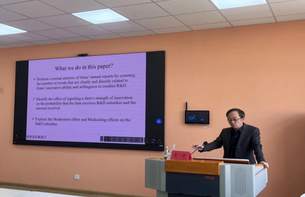 2024年4月18日14:00,上海财经大学公共经济与管理学院的吴一平教授在开云网页版登录入口三号实验楼423会议室为经济学院师生做了题为《Effect of innovation disclosure in annual reports on R&D subsidies in China》的学术报告。讲座由开云网页版登录入口高玉强教授主持,部分师生参与了此次学术交流活动。