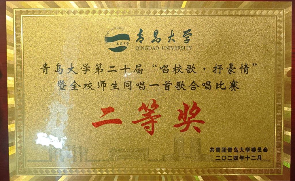 12月14日,由青岛大学团委举办、青岛大学大学生艺术团承办的第二十届“唱校歌·抒豪情”暨全校师生同唱一首歌合唱比赛在浮山校区体育馆举办。由我院任龙、张之峰、常璟、赵金鑫、李奕霖5位老师带领的合唱队在学校第二十届“唱校歌·抒豪情”暨全校师生同唱一首歌合唱比赛中荣获大赛二等奖。