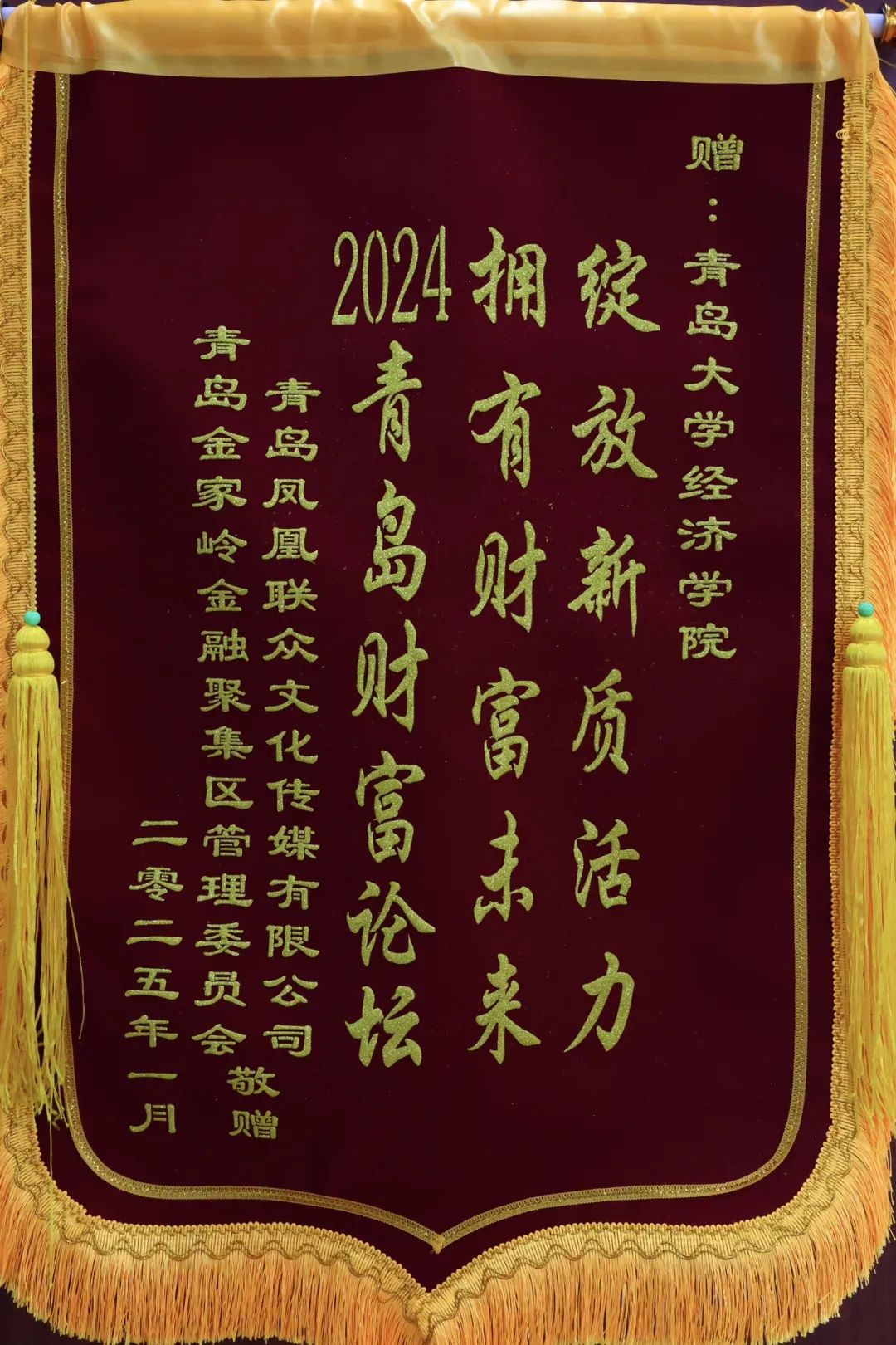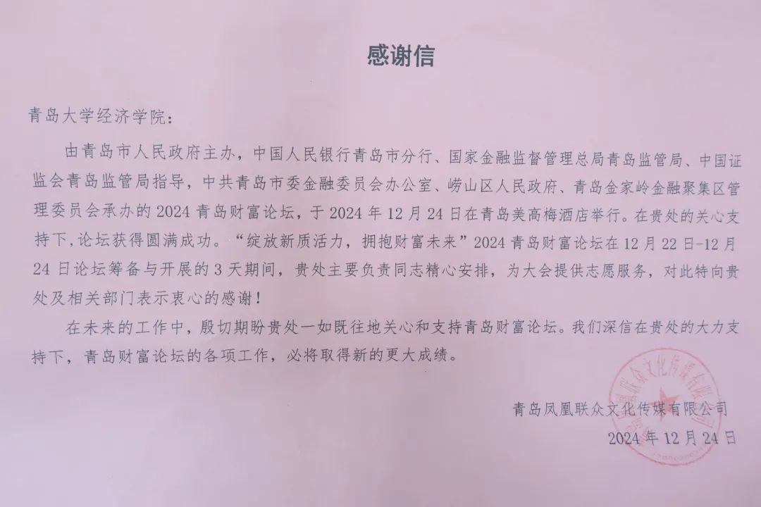 近日,青岛金家岭金融聚集区管理委员会、青岛凤凰联众文化传媒有限公司送来锦旗和感谢信,对我院经彩青春服务队在2024青岛财富论坛中的志愿服务表现给予高度肯定。
