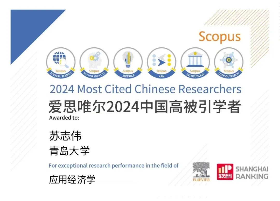 3月25日,爱思唯尔(Elsevier)发布2024年“中国高被引学者”(Highly Cited Chinese Researchers)榜单。开云网页版登录入口苏志伟教授入选“应用经济学”学科2024年度“中国高被引学者”。这是苏志伟教授连续第五年入选该榜单。