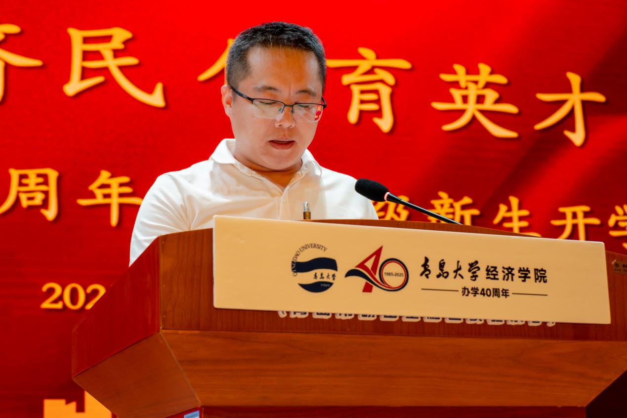 优秀教师代表、2025级跨境电商班班主任韩兆安在发言中勉励新生,要善于从现实中理解经济学,并承诺将以多元的教学助力学生成长,引领新生进入更加广阔的天地。他希望同学们在四年的探索中掌握扎实本领,最终成长为懂专业、明大德的杰出人才。