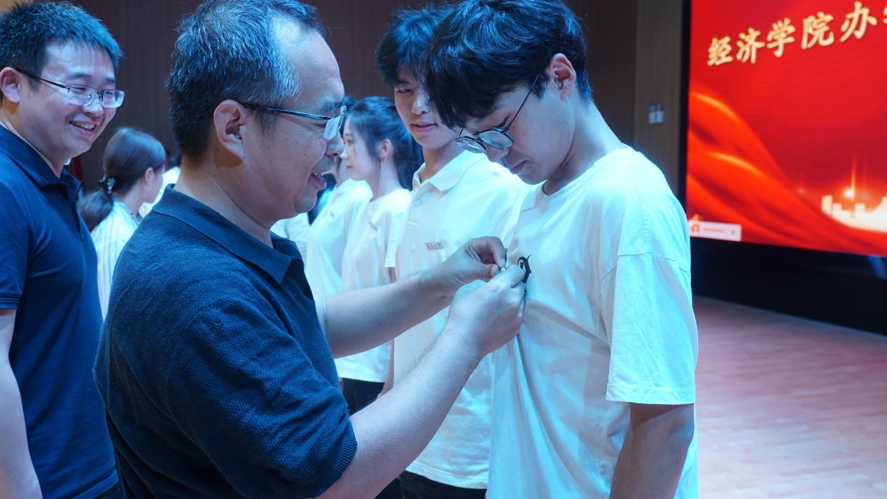 校徽佩戴仪式上,教师代表为新生代表佩戴校徽,象征着身份的传承与责任的交付,标志着2025级新生正式成为“青大人”,开启在青岛大学的求学之旅。