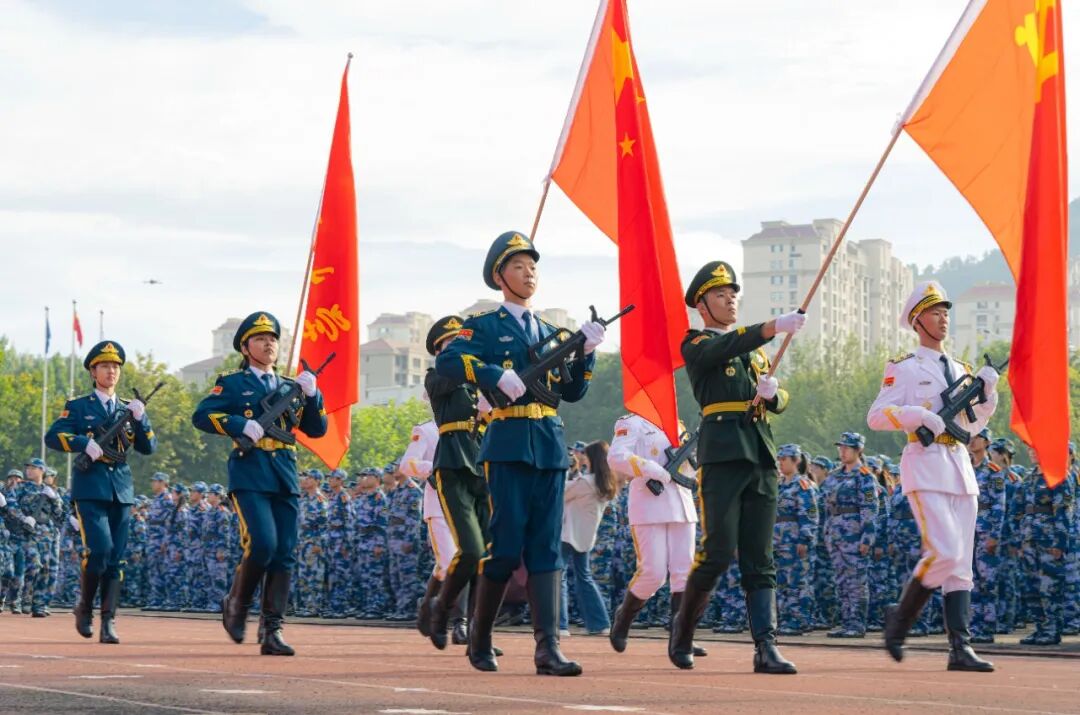 同学们身着统一军装,口号响彻云霄,身姿挺拔,以严整的军容、高昂的士气走过主席台,接受检阅。每一个动作都精准到位,每一声口号都铿锵有力,充分展现了经院学子坚韧不拔的意志和顽强拼搏的精神风貌。
