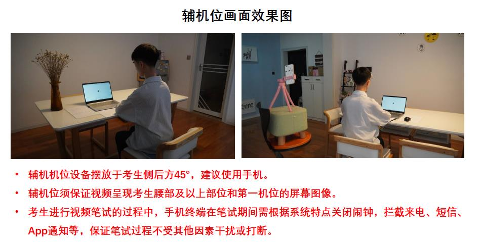 1.考生需准备好支持“双机位”模式的软硬件,包括2部带摄像头的设备,支持高清视频通话的电脑或智能手机均可。主机位设备摆放于考生正面,用于登录主机位客户端,由于要显示试题,建议尽量使用电脑;辅机位设备摆放于考生侧后方45°,用于登录辅机位客户端,建议使用手机。