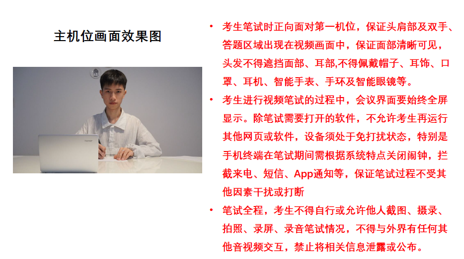 2.考生笔试时正向面对主机位,保证头肩部及双手、答题区域出现在视频画面中,保证面部清晰可见,头发不得遮挡面部、耳部,不得佩戴帽子、耳饰、口罩、耳机、智能手表、手环及智能眼镜等。辅机位须保证视频呈现考生腰部及以上部位和第一机位的屏幕图像。