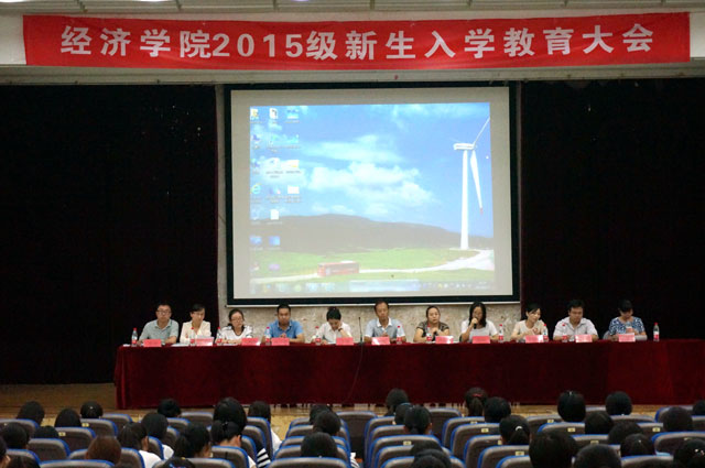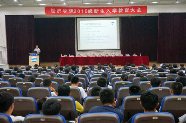 9月25日下午,经济学院在东校区图文中心四楼报告厅举办2015级新生入学教育大会。本次会议由学院党委副书记于苗主持,学院副院长张旭、学院教科办主任孙延鹏、15级学业导师及辅导员出席了会议,心理健康教育与研究处主任米振宏也受邀出席。2015级全体新生参会。
