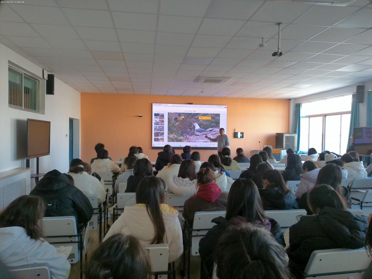 薛琳长期致力于生态保育与生态教育公益事业,他从青岛野生鸟类及鸥类的资源状况、青岛鸥类的分布及重要栖息地、青岛观鸥的注意事项等三方面入手,以通俗的语言、丰富的观鸟经验,向师生们详细介绍了当下海鸥的生存现状,强调保护海鸥的重要性,从四个季节分别向师生们介绍了海鸥的生存习性,细致入微地讲解了海鸥与人类间的动人故事,为师生们带来一场生动的鸟类知识盛宴。